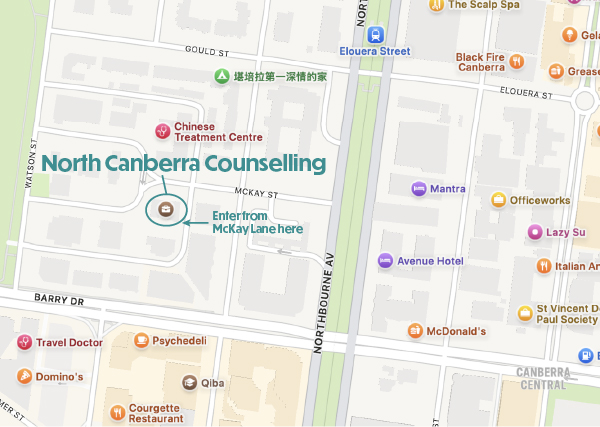 I am located at North Canberra Counselling in Turner, ACT – with free onsite parking or a 5 minute walk from the Elouera Light Rail Station and Northbourne Avenue.